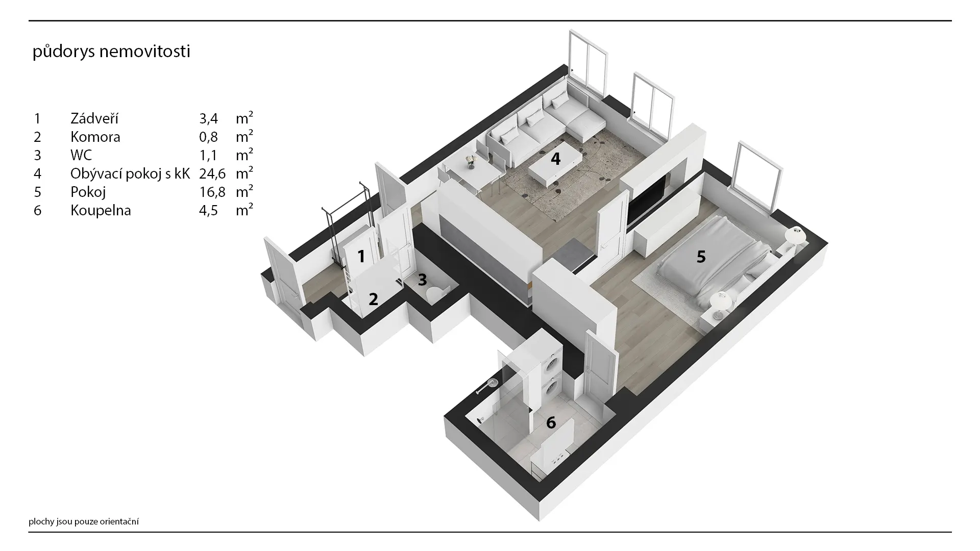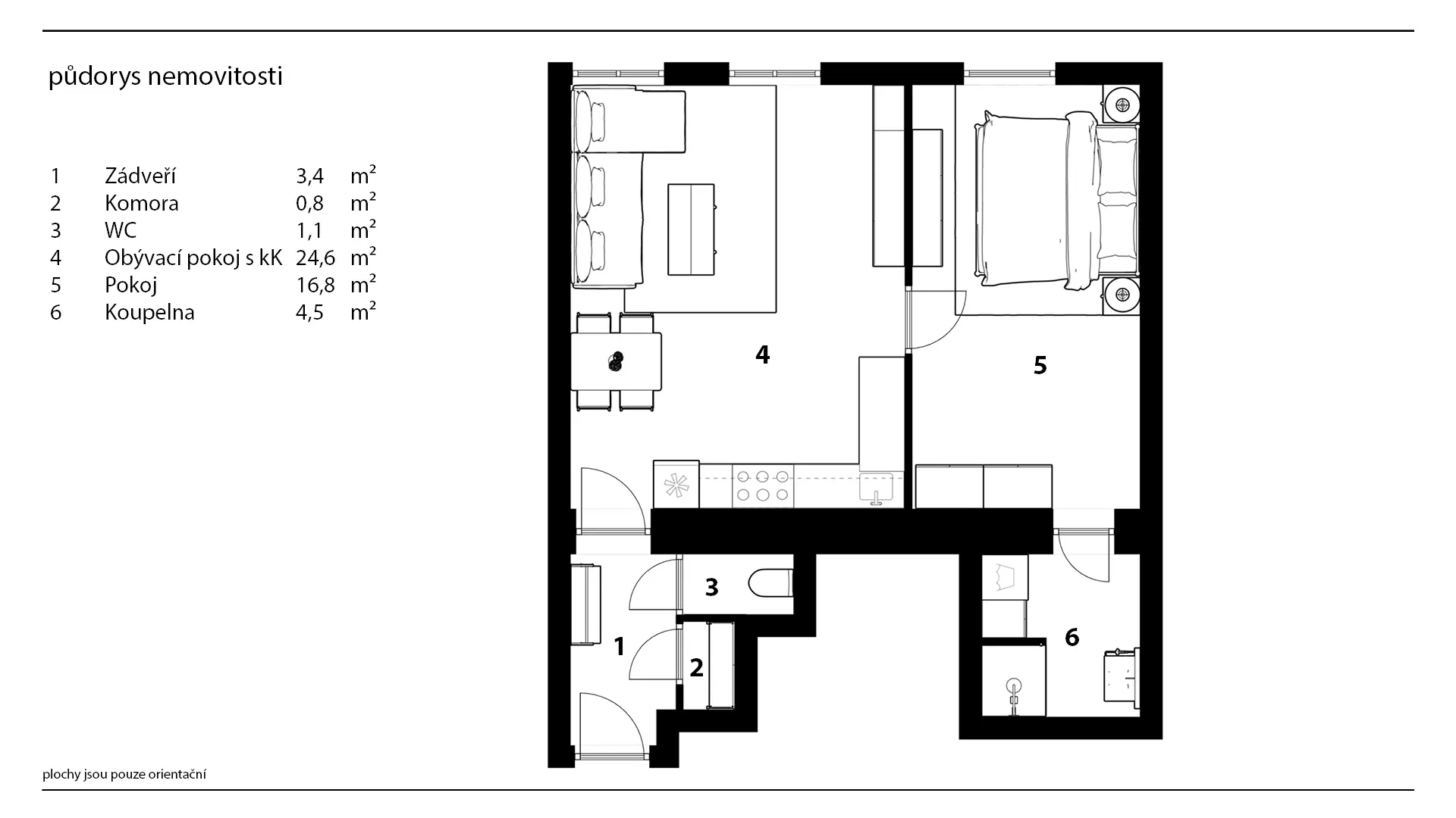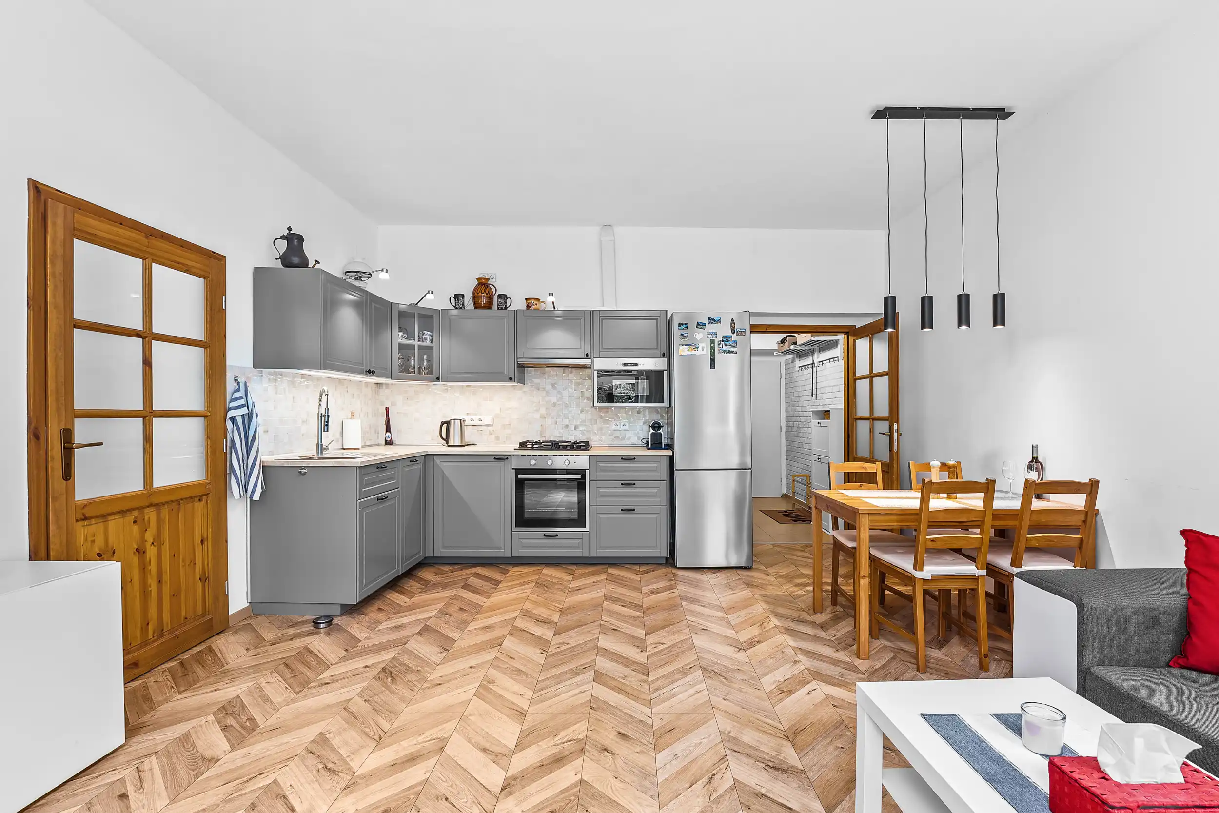 Byt disponuje širokým kuchyňským koutem, který uspokojí Vaše náročné kuchařské potřeby, zatímco prostorný obývací pokoj s ložnicí umožní vlastní realizaci bytové potřeby bez nutnosti kompromisu na počtu věcí či nábytku.
